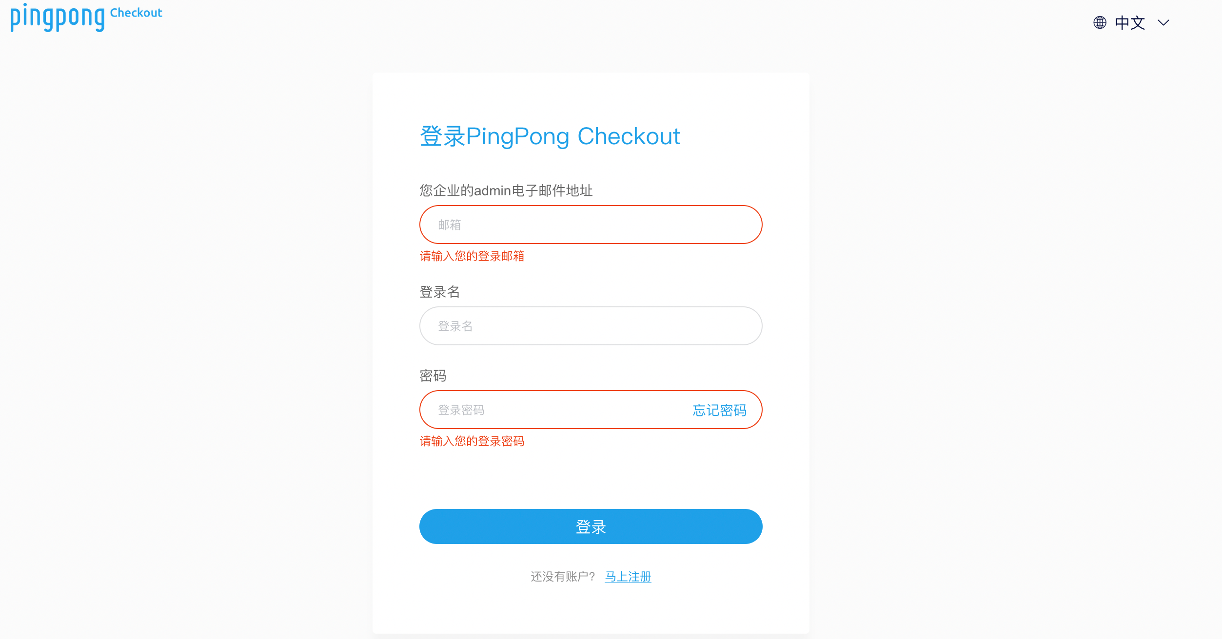 已注册的商户可直接进行登陆操作,在浏览器地址栏输入 https://checkout.pingpongx.com/ ,即可进入商户服务平台登录页。(建议使用 Chrome 浏览器) 在登录页输入企业admin邮件地址、登录名、密码来完成登录。